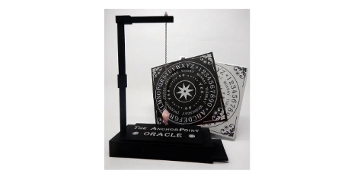 Crystal Pendulum, Spirit Board, Storage Base Stand, & Instruction Manual.